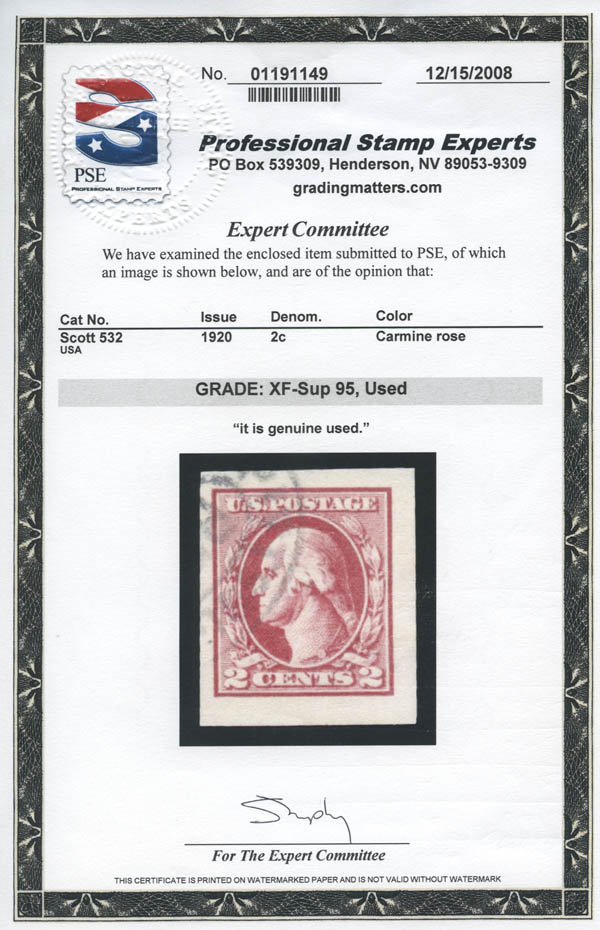 Lote 304 o 1918, 2¢ Washington, carmine rose, type IV, offset printing, imperf (Scott 532), exceptionally choice centering and margins and a neat corner cancel, Extremely Fine to Superb, with 2008 P.S.E. certificate graded XF-SUP 95. SMQ $95. Estimate $60 - 80. |