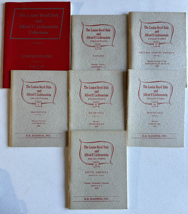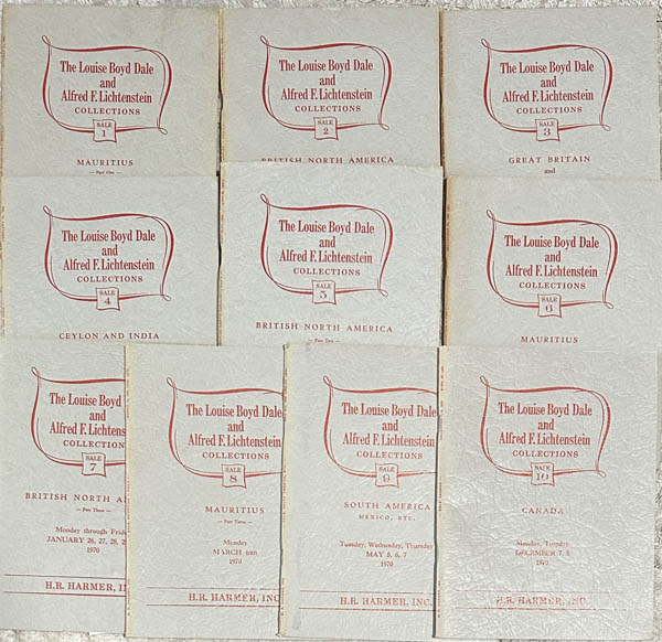 ![]() H.R. Harmer, The Louise Boyd Dale and Alfred F. Lichtenstein Collections, 1968-70, set of 10 sales plus the prospectus in excellent condition, Extremely Fine. Estimate $120 - 180. View details and enlarged photo | Unsold |