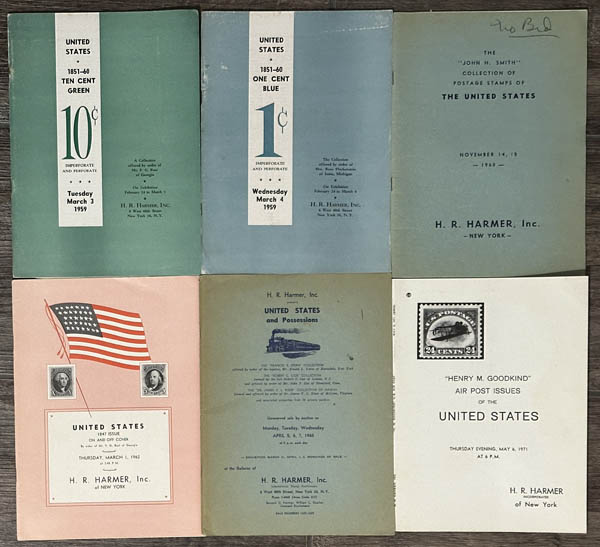 ![]() H.R. Harmer, Various U.S. Auctions, including 1851-60 Ten Cent Green, 1959 (with prices realized); 1851-60 One Cent Blue, 1959 (with prices realized); The John H. Smith Collection of Postage Stamps of the United States, 1960; United States 1847 Issue on and off Cover, 1962 (with prices realized); United States and Possessions, 1965 (with prices realized); and Henry M. Goodkind Air Post Issues of the United States,1971 (with prices realized); an amazing group of old time soft bound auction catalogs in great condition! Estimate $60 - 80. View details and enlarged photo | Unsold |