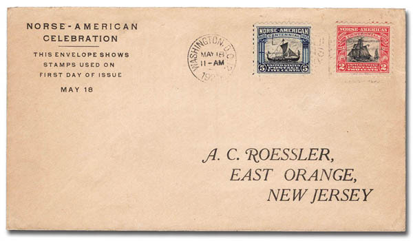 ![]() 1925, Norse-American complete (Scott 620-621), set of 2, on a Roessler First Day Cover from Washington, DC, Very Fine. Scott $50. Estimate $50 - 75. View details and enlarged photo | Unsold |