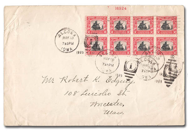 ![]() 1925, 2¢ Norse-American (Scott 620), plate block of 8 used on the first day May 18, 1925; slightly wrinkled, Fine to Very Fine, a rare large multiple usage. Scott catalog value is $450 for unused off cover. Estimate $150 - 200. View details and enlarged photo | Unsold |