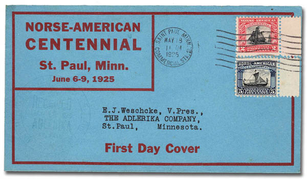 ![]() 1925, Norse-American complete (Scott 620-621), set of 2, on E.J. Weschcke cachet First Day Cover from St. Paul, Minn; according to Planty only 200 of these were made, Very Fine. Estimate $150 - 200. View details and enlarged photo | Unsold |