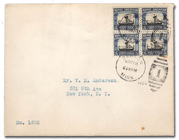 ![]() 1925, 5¢ Norse-American (Scott 621), centerline block of 4 on a First Day Cover from Benson, Minn., Fine to Very Fine. Estimate $75 - 100. View details and enlarged photo | Realized $50 |