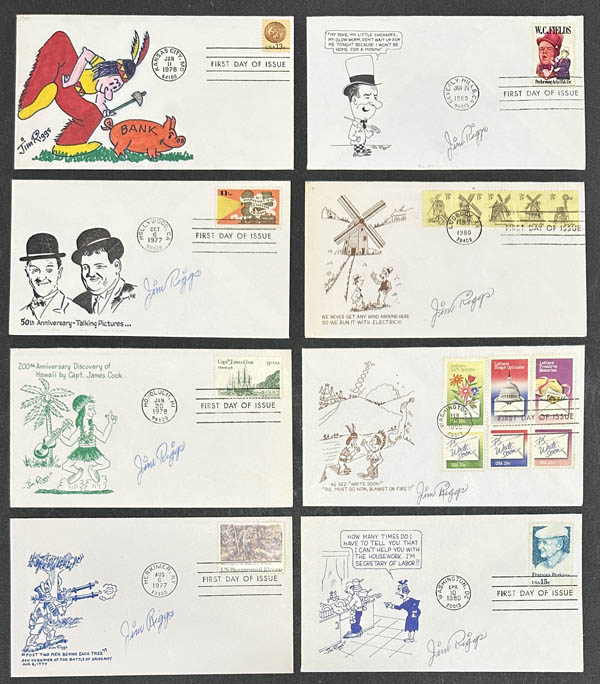 ![]() 1977-81, a group of 16 first day covers with humorous cachets, signed "Jim Riggs", all unique cachets and all personally signed by the artist, one of which is hand drawn and another is a limited edition no. 52/100, Very Fine. Estimate $60 - 80. View details and enlarged photos | Unsold |