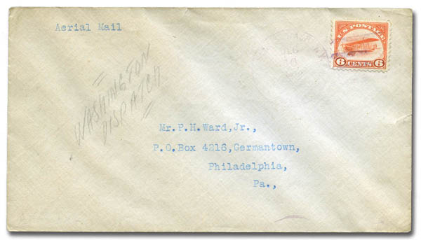 ![]() Airmail, 1918, 6¢ Jenny (Scott C1), well centered, tied by lightly struck Washington-NY-Philadelphia cancel in purple on a first flight cover to Philadelphia. A tiny edge tear at right, Fine to Very Fine overall. Scott $2,000. Estimate $500 - 750. View details and enlarged photo | Unsold |