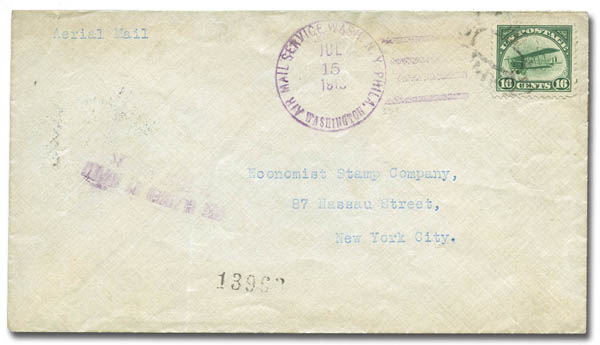 ![]() Airmail, 1918, 16¢ Jenny (Scott C2), tied by Washington-NY-Philadelphia cancel in purple on a first flight cover to New York City. A couple light vertical file folds, Fine to Very Fine overall. Scott $800. Estimate $250 - 350. View details and enlarged photo | Unsold |