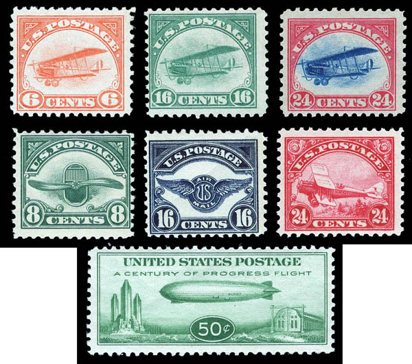 ![]() /![]() Airmail, 1918-33, First and Second Issues complete, plus 50¢ Chicago Zepp (Scott C1-C6, C18), set of 7, fine overall. Scott $635. Estimate $50 - 75. Details und vergrössertes Foto betrachten | Zuschlag $55 |