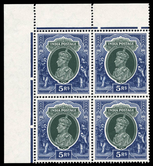![]() ![]() ![]() India, 1937, King George VI, 5r green & blue (Scott 164. SG 261), an outstandingly choice corner margin block of 4, o.g., never hinged, Extremely Fine, cataloged as hinged - never hinged is worth much more - and this stamp is seriously undercataloged in Scott. Scott $116. SG £192 ($230). Estimate $50 - 75. Ver detalles y foto agrandada | Adjudicación $65 |