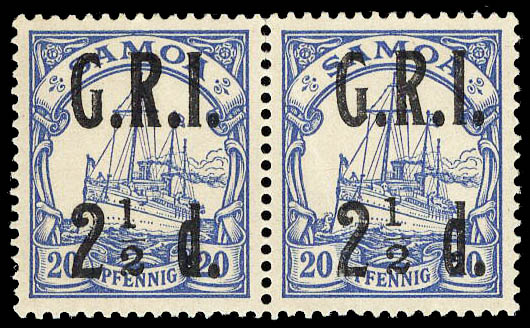 ![]() ![]() Samoa, 1914, G.R.I. 2½d on German Samoa 20pf ultramarine (Scott 104. SG 104), horizontal pair, fresh and well centered, o.g., never hinged, Extremely Fine, catalog values are for hinged - NH is worth a premium. Scott $125. SG £120 ($140). Estimate $60 - 80. Ver detalles y foto agrandada | Adjudicación $60 |
