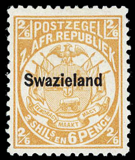 ![]() Swaziland, 1890, Coat of Arms, 2s6d buff (Scott 6. SG 7), o.g., hinged, Very Fine, signed Bock and Economist. Scott $325. SG £325 ($380). Estimate $100 - 150. Ver detalles y foto agrandada | Adjudicación $90 |