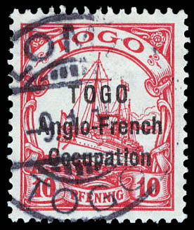 o Togo, 1915, "Anglo-French Occupation" on German Togo, 3rd Setting, 10pf carmine (Scott 63. SG H31), neat Lome c.d.s., Very Fine. Scott $130. SG £150 ($180). Estimate $50 - 75. Ver detalles y foto agrandada | Adjudicación $60 |