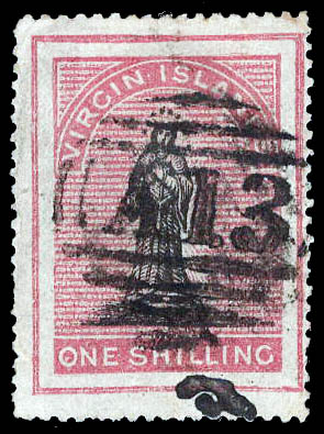 o Virgin Islands, 1867, St. Ursula, 1s black & rose carmine, perf 12, white paper (Scott 7. SG 21), A13 cancel, Fine. Scott $300. SG £190 ($220). Estimate $75 - 100. Ver detalles y foto agrandada | Adjudicación $75 |