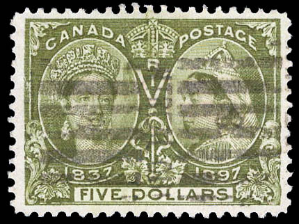 o Canada, 1897, Queen Victoria Jubilee, $5 olive green (Scott 65), a well centered high value with a light roller cancel, Very Fine. Scott $1,000. Estimate $250 - 350. Ver detalles y foto agrandada | Adjudicación $260 |