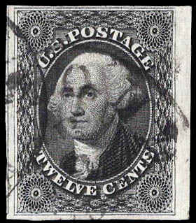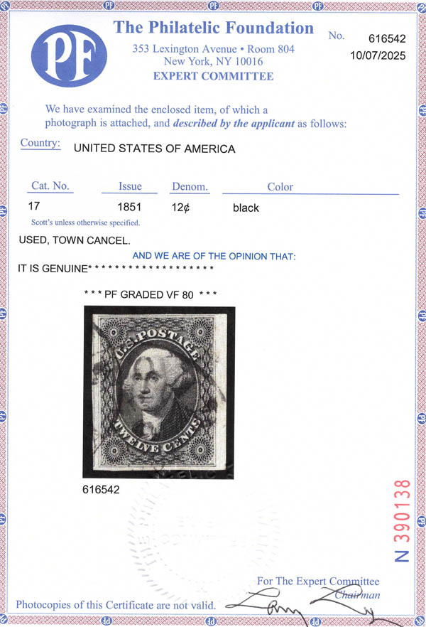 Lot 10 o 1851, 12¢ Washington, gray black (Scott 17), 4 large to huge margins including parts of the next stamp at left and sheet margin at right, town cancellation, Very Fine, with 2025 P.F. certificate graded VF 80. Scott $260. Estimate $180 - 240. |