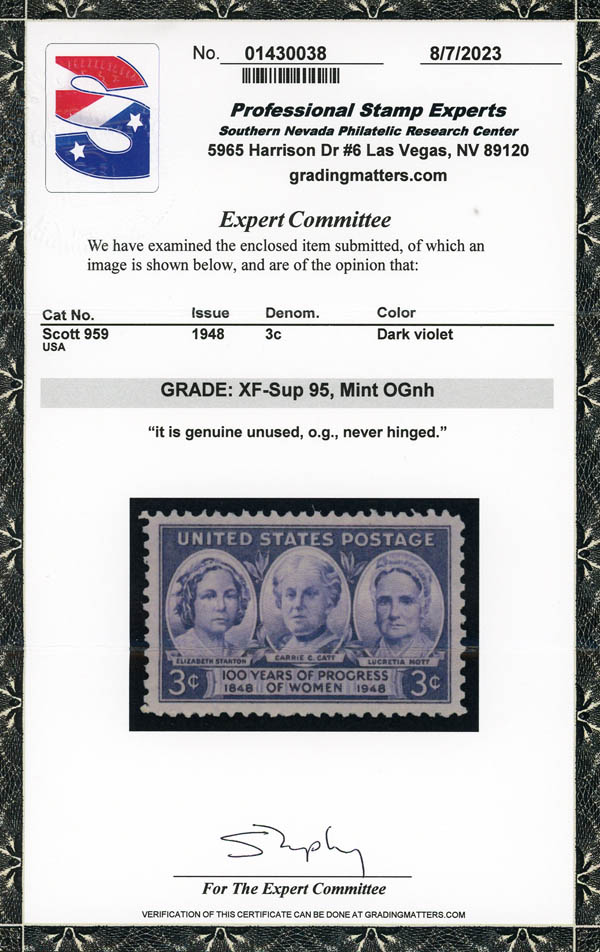 1948, 3¢ Progress of Women (Scott 959), o.g., never hinged, Extremely Fine to Superb, with 2023 P.S.E. certificate graded XF-SUP 95. SMQ $35.