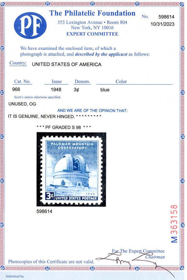 1948, 3¢ Palomar Observatory (Scott 966), o.g., never hinged, Superb, with 2023 P.F. certificate graded SUP 98. SMQ $50.