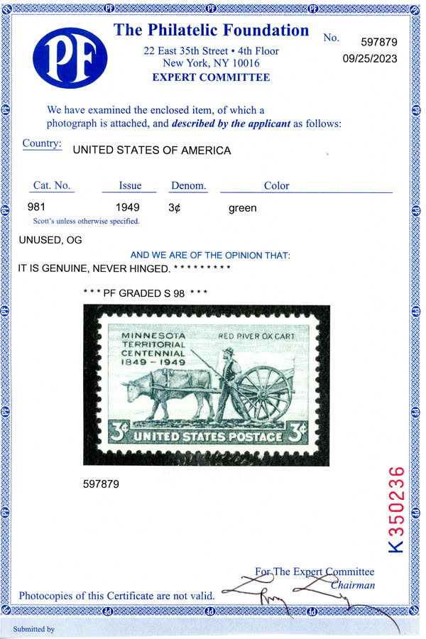 1949, 3¢ Minnesota Territory (Scott 981), o.g., never hinged, Superb, with 2023 P.F. certificate graded SUP 98. SMQ $60.