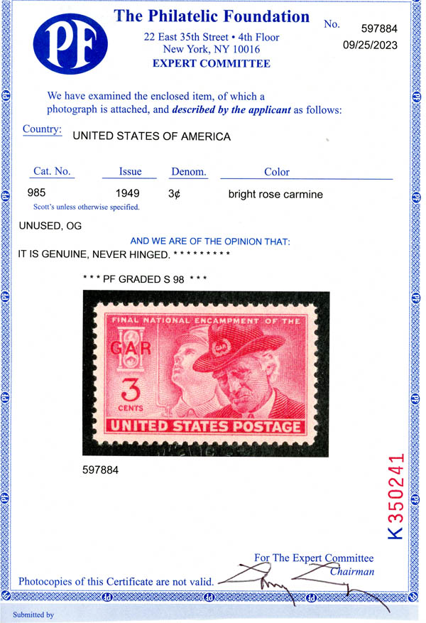 1949, 3¢ Grand Army of the Republic (Scott 985), o.g., never hinged, Superb, with 2023 P.F. certificate graded SUP 98. SMQ $60.