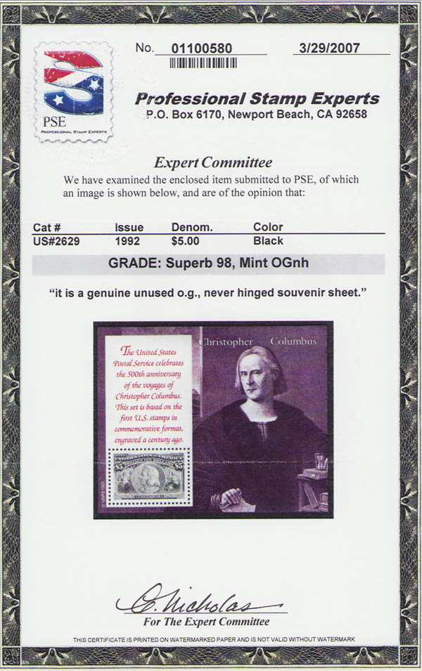 1992, Voyages of Columbus, souvenir sheet of 1, "Christopher Columbus" (Scott 2629), o.g., never hinged, Superb, with 2007 P.S.E. certificate graded SUP 98.