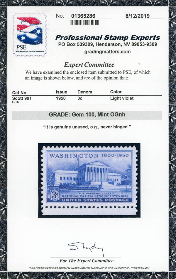 1950, 3¢ National Capital: Supreme Court (Scott 991), o.g., never hinged, Superb, with 2019 P.S.E. certificate graded Gem 100. SMQ $150.