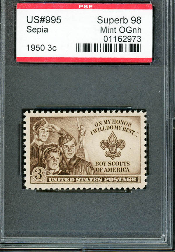 1950, 3¢ Boy Scouts (Scott 995), o.g., never hinged, Superb, with encapsulated P.S.E. certificate graded SUP 98. SMQ $65.