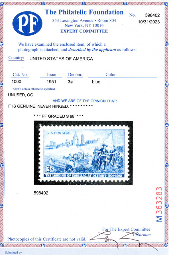 1951, 3¢ Landing of Cadillac (Scott 1000), o.g., never hinged, Superb, with 2023 P.F. certificate graded SUP 98. SMQ $65.