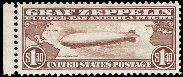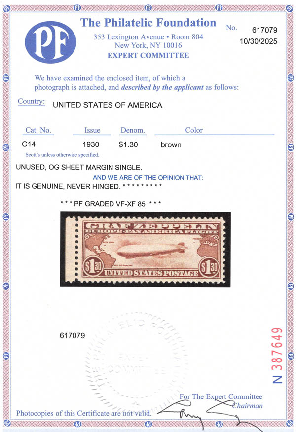 Lot 1034![]() ![]() Airmail, 1930, $1.30 Graf Zeppelin (Scott C14), sheet margin single, o.g., never hinged, Very Fine to Extremely Fine, with 2025 P.F. certificate graded VF-XF 85. Scott $575. SMQ $600. Scott Stamp Values $625. Estimate $400 - 600. |