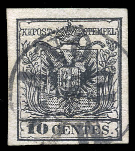 Lot 104 o Italian States: Lombardy-Venetia, 1850, Coat of Arms, 10c black, hand-made paper (Scott 3. Michel 2 X a. Sassone 2), ample margins all around, light town cancel, Fine to Very Fine. Scott $150. Sassone €250 ($270). Estimate $50 - 75. |