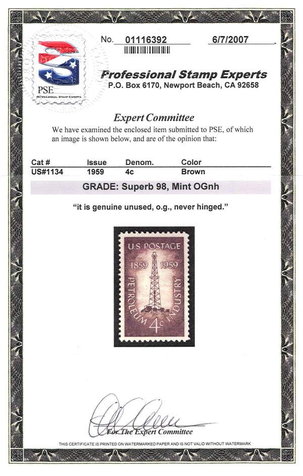 1959, 4¢ Petroleum Industry (Scott 1134), o.g., never hinged, Superb, with 2014 P.S.E. certificate graded SUP 98. SMQ $55.