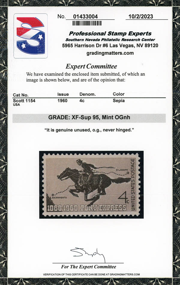 1960, 4¢ Pony Express (Scott 1154), o.g., never hinged, Extremely Fine to Superb, with 2023 P.S.E. certificate graded XF-SUP 95. SMQ $35.