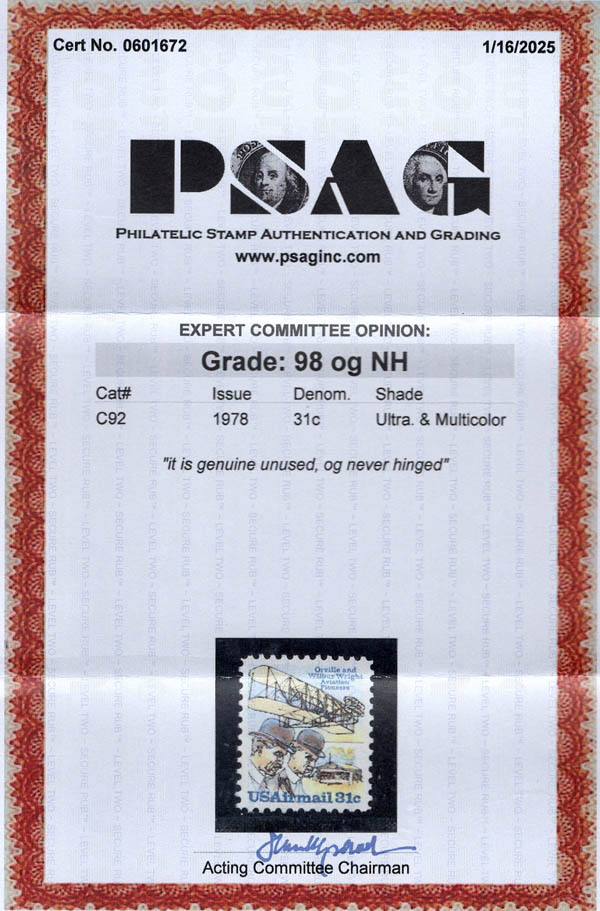 Airmail, 1978, 31¢ Wright Brothers (Scott C92), o.g., never hinged, Superb, with 2025 P.S.A.G. certificate graded SUP 98. SMQ $140.