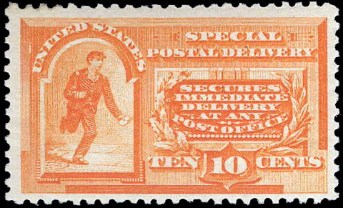 Special Delivery, 1893, 10¢ orange (Scott E3), o.g., lightly hinged, almost Very Fine. Scott $300.