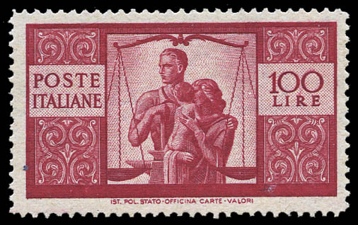 Italy, 1946, 100L "Democracy" issue high value (Scott 477. Sassone 565), o.g., never hinged, Very Fine. Scott $400. Sassone €575 ($630).