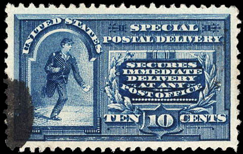 Special Delivery, 1894, 10¢ blue, unwatermarked (Scott E4), wonderfully well centered, unobtrusive cancel, Extremely Fine. Scott $110.