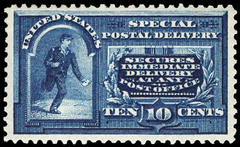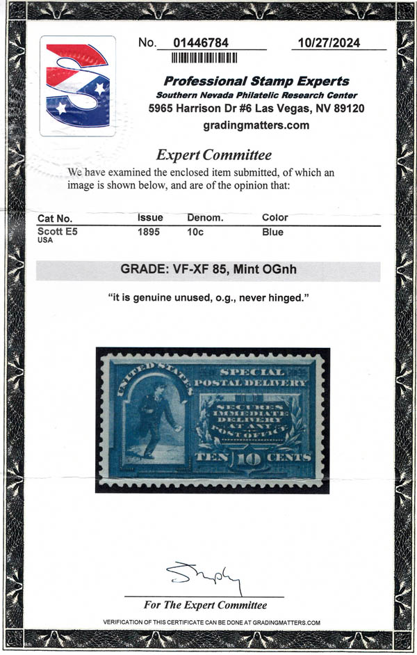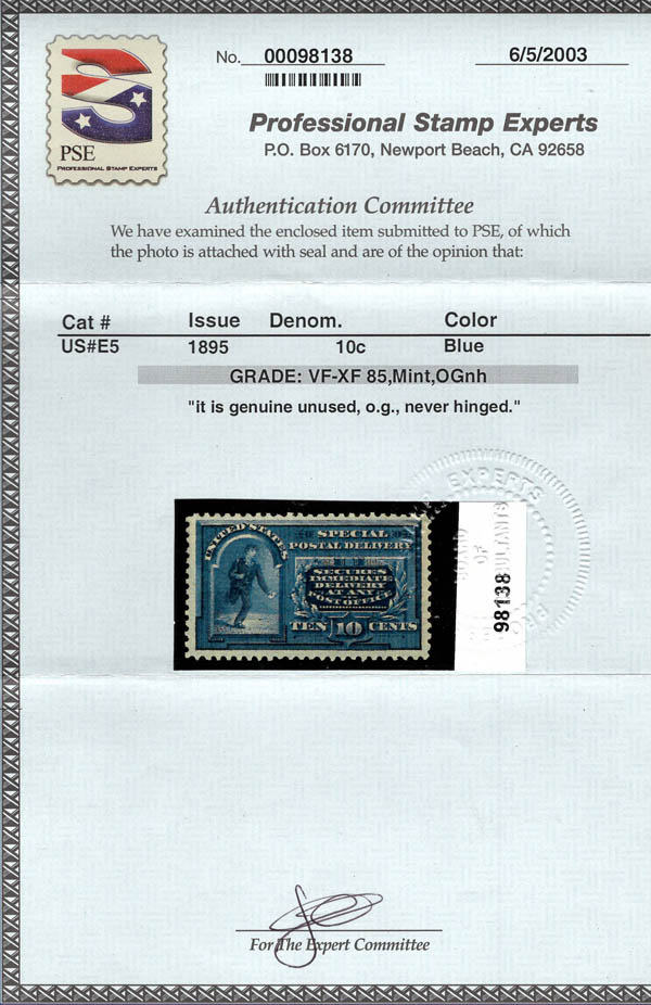 Lot 1064![]() ![]() Special Delivery, 1895, 10¢ blue (Scott E5), deep luxuriant color, o.g., never hinged, Very Fine to Extremely Fine, with 2003 and 2024 P.S.E. certificates, each graded VF-XF 85. Scott $475. SMQ $675. Estimate $400 - 600. |