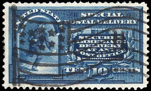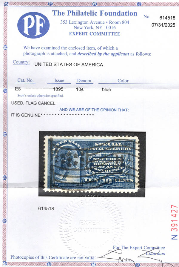 Lot 1066 o Special Delivery, 1895, 10¢ blue (Scott E5), magnificently centered and should be graded, socked-on-the-nose flag cancel (Spanish-American War era), Extremely Fine to Superb, with 2025 P.F. certificate. Scott $13. Estimate $120 - 180. |