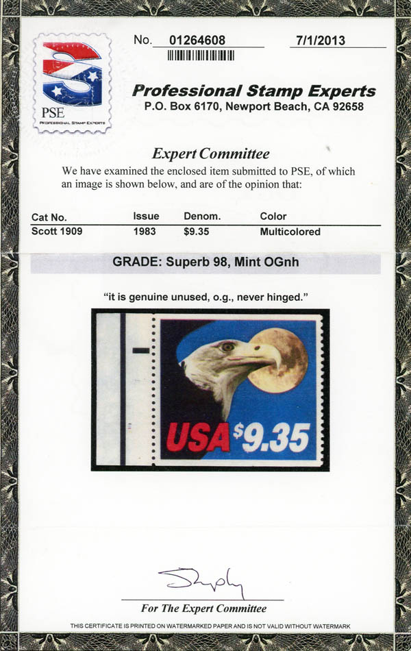 1983, $9.35 Eagle and Moon (Scott 1909), o.g., never hinged, Superb, with 2013 P.S.E. certificate graded SUP 98. SMQ $130.