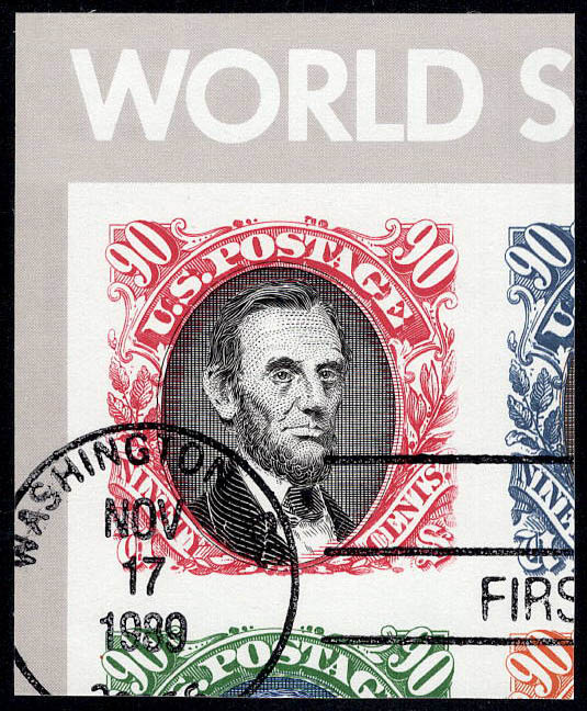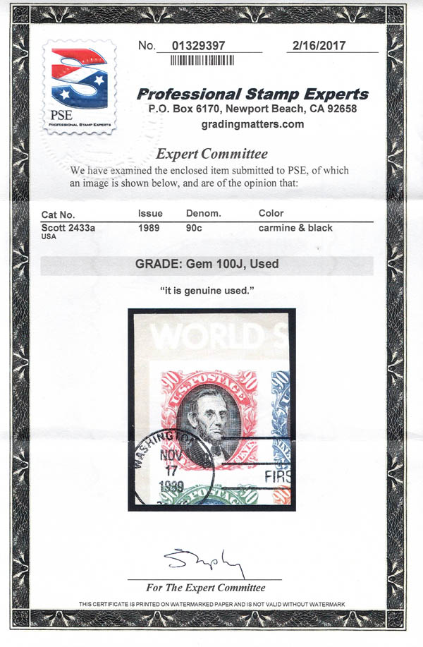 Lot 1072 o 1989, 90¢ World Stamp Expo '89, single from souvenir sheet (Scott 2433a), neat first day cancel, Superb, the only used one at this lofty level, with 2017 P.S.E. certificate graded Gem 100J. Estimate $50 - 75. |