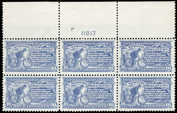 Special Delivery, 1917, 10¢ ultramarine (Scott E11), a remarkably choice top plate block of 6, well centered throughout, o.g., lightly hinged, Extremely Fine. Scott $225.