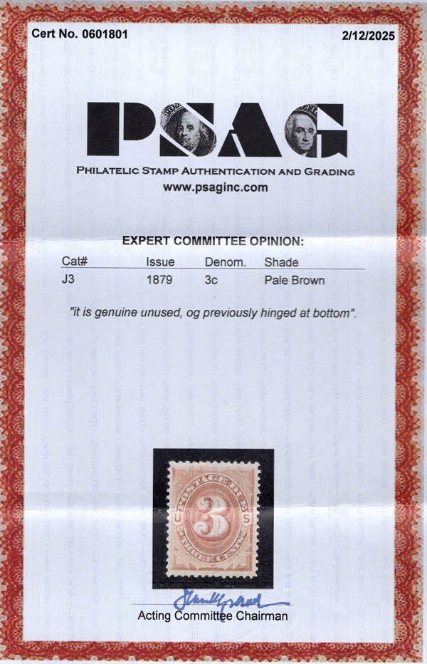 Postage Due, 1879, 3¢ brown (Scott J3), o.g., hinged, Very Fine, with 2025 P.S.A.G. certificate. Scott $100.