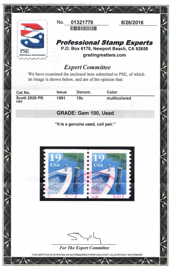 1991, 19¢ Fishing Boat coil, two rope loops, type I (Scott 2529), light double circle cancel, Superb, the only one with this lofty grade, with 2016 P.S.E. certificate graded Gem 100.