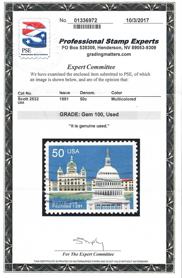 1991, 50¢ Switzerland (Scott 2532), light wavy line machine cancel, Superb, the only one with this lofty grade, with 2017 P.S.E. certificate graded Gem 100.