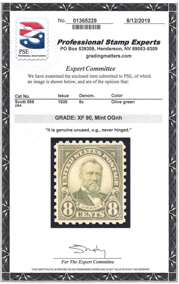 1926, 8¢ Grant, rotary press printing, perf. 10 (Scott 589), o.g., never hinged, Extremely Fine, with 2019 P.S.E. certificate graded XF 90. Scott $58. SMQ $125.