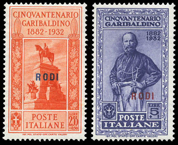 Lot 115![]() Italian Occupation of the Aegean Islands: Rhodes, 1932, Garibaldi issue complete (Scott 45-54. Sassone 20-29 (S. 75)), set of 10, o.g., lightly hinged, Fine to Very Fine. Scott $190. Sassone €260 ($280). Estimate $60 - 80. |