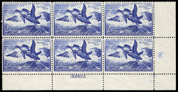 Federal Duck Stamp, 1952, $2 Harlequin Ducks (Scott RW19), plate block of 6, o.g., never hinged, Very Fine. Scott $550.