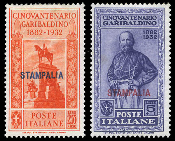 Lot 118![]() Italian Occupation of the Aegean Islands: Stampalia, 1932, Garibaldi issue complete (Scott 17-26. Sassone 17-26 (S. 84)), set of 10, o.g., hinged or hinge remnant, Fine to Very Fine. Scott $190. Sassone €260 ($280). Estimate $60 - 80. |