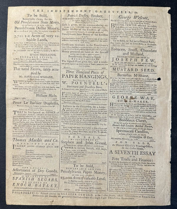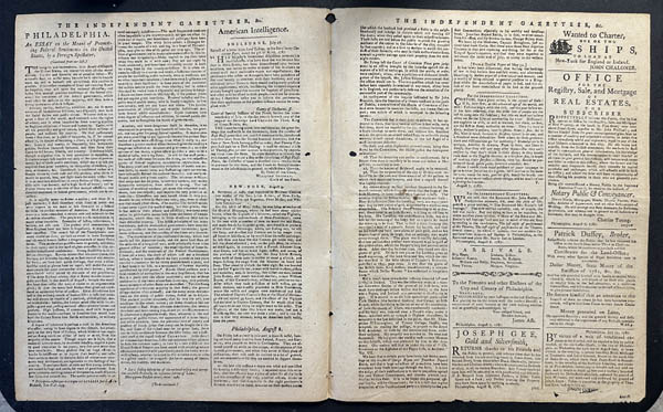 Lot 12 Political Memorabilia, The Independent Gazetteer, newspaper, 1787, one of the earliest and most politically active American newspapers of the Revolutionary and post-Revolutionary period in Philadelphia, it began in 1782 and became famous for its radical pro-liberty and anti-Federalist tone. This particular issue - Vol. VI, No. 517 (August 8, 1787) - was printed just weeks before the signing of the U.S. Constitution (September 17, 1787), making it a piece of American journalism from the Constitutional Convention era. Estimate $400 - 600. |