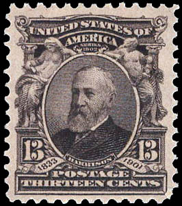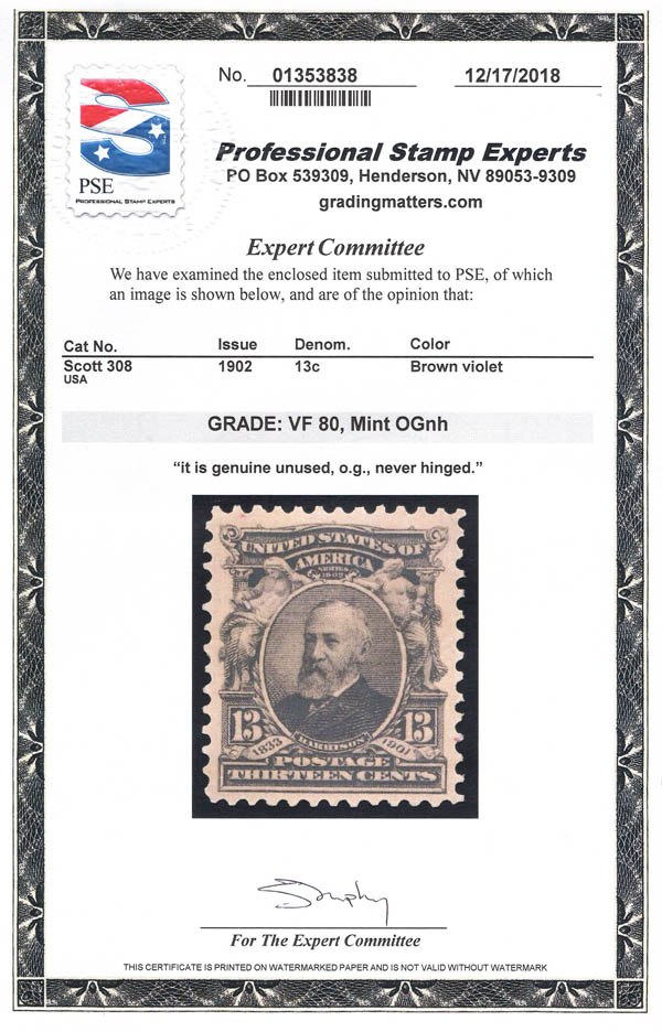 1902, 13¢ Harrison, purple black (Scott 308), o.g., never hinged, Very Fine, with 2018 P.S.E. certificate graded VF 80. Scott $100. SMQ $120.