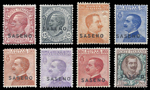 Lot 121![]() Italian Colonies: Saseno, 1923, overprints on Victor Emmanuel III - the country complete (Scott 1-8. Sassone 1-8 (S. 1)), set of 8, o.g., lightly hinged, Fine to Very Fine. Scott $260. Sassone €600 ($650). Estimate $75 - 100. |