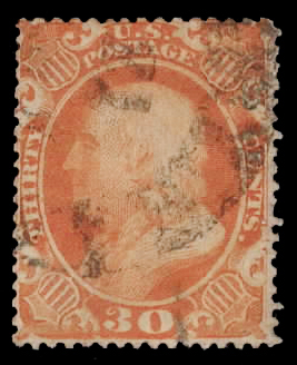 1860, 30¢ orange (Scott 38), lightly canceled, Fine.